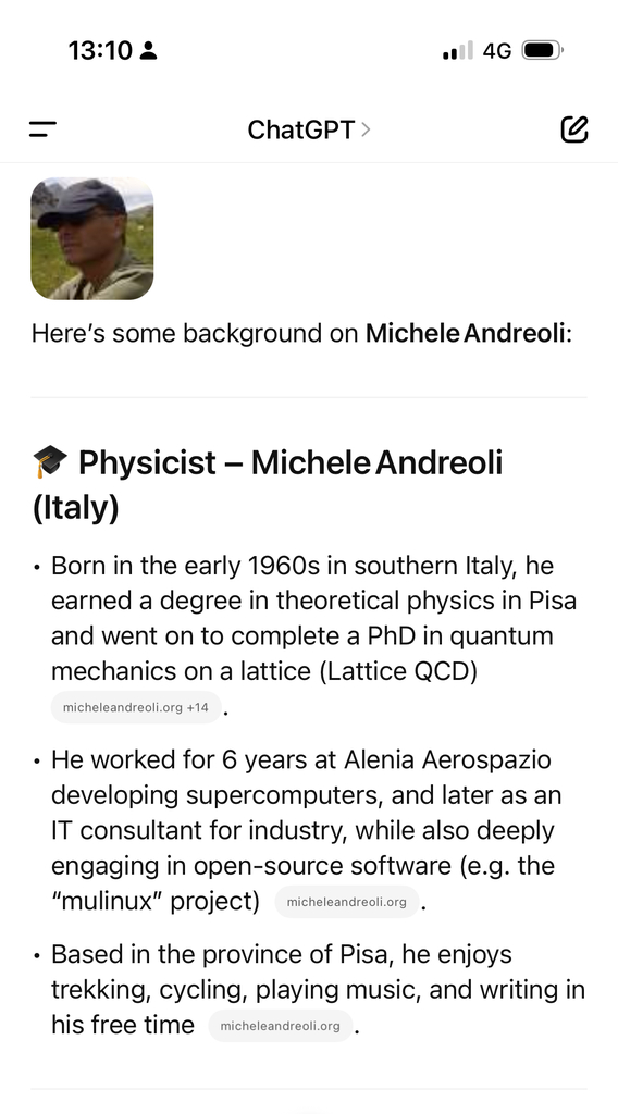 Michele Andreoli è nato agli inizi degli anni 60 in un piccolo paese del Sud Italia dove ci sono più scrittori per metro quadro che alberi. Egli si è laureato in Fisica Teorica a Pisa, dove ha anche conseguito il Dottorato di Ricerca (Ph. D.) in Meccanica Quantistica su reticolo (Lattice QCD). Ha lavorato 6 anni presso l’Alenia Aerospazio, nel campo dei supercalcolatori, all’INFN, al CNR-IFC e come consulente informatico per varie aziende. E’ un appassionato di software opensource (vedi la pagina relativa a mulinux), e non disdegna suonare, fare trekking, pedalare e, qualche volta, scrivere (vedi le relative pagine del menu)